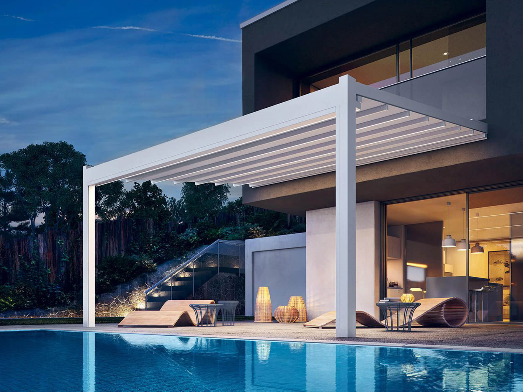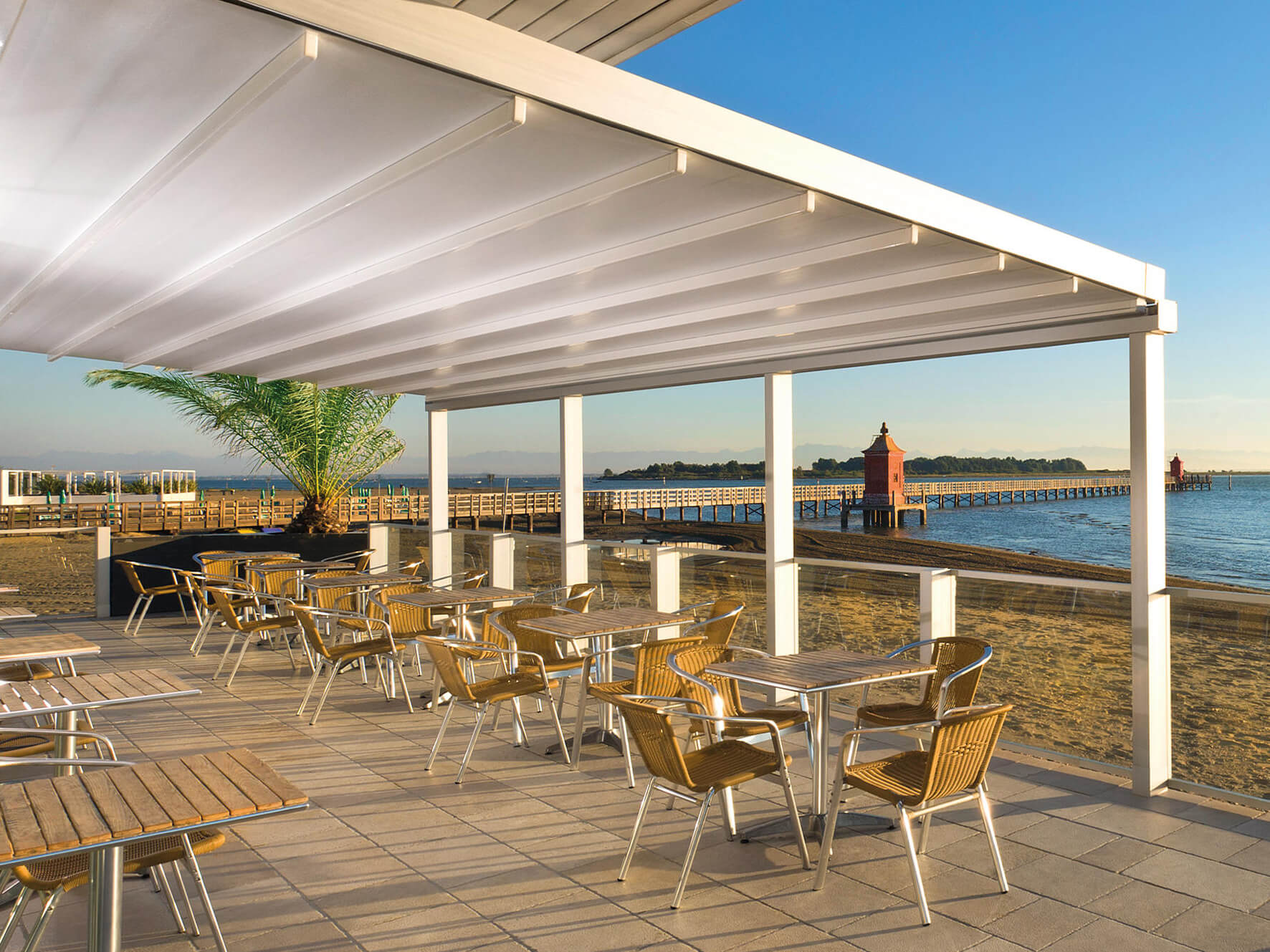 Für noch mehr Komfort lässt sich Onda individuell erweitern: zum Beispiel mit verschiebbaren Glaselementen, Vorhängen, Glasabdeckungen, ausziehbarem Windschutz aus Glas oder integrierter LED-Beleuchtung.